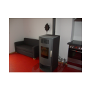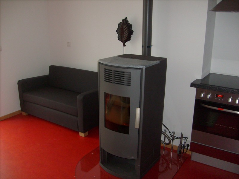 Der Pelletofen heizt nicht nur die Wohnung, sondern ist auch an die Zentralwasserversorgung angeschlossen. und unterstützt somit die 6 Solarelemente. Durch die doppelflüglige Tür mit französischem Balkon hat man einen schönen Blick in den Garten.